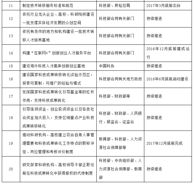 “十三五”期间,推动一批短中期见效、有力带动产业结构优化升级的重大科技成果转化应用,企业、高校和科研院所科技成果转移转化能力显著提高,市场化的技术交易服务体系进一步健全,科技型创新创业蓬勃发展,专业化技术转移人才队伍发展壮大,多元化的科技成果转移转化投入渠道日益完善,科技成果转移转化的制度环境更加优化,功能完善、运行高效、市场化的科技成果转移转化体系全面建成。