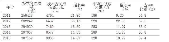 “十二五”期间,我国年均28万余项技术成果实现转移转化,技术合同成交额呈现高速增长态势,改变了财政单一的科技投入结构,成为全社会R&D(研究与开发)投入的重要渠道,为稳增长、转方式、调结构提供了重要支撑。2015年,全国技术合同共成交307132项,成交额比上年增长14.7%,达到9835亿元,是“十一五”末的2.5倍,相当于同年全社会R&D(研究与开发)经费投入的69.4%,平均每项技术合同成交额320万元,比上年增长10.7%。