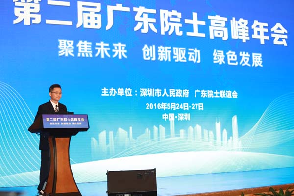 5月25日,第二届广东院士高峰年会在深圳开幕,70位两院院士携团队参加。十一届全国人大副委员长、中国科学院原院长路甬祥和中国工程院院士、中国工程院副院长徐德龙分别作了《科技与产业创新的新特点》《推进绿色制造 建设幸福家园》大会特邀报告。