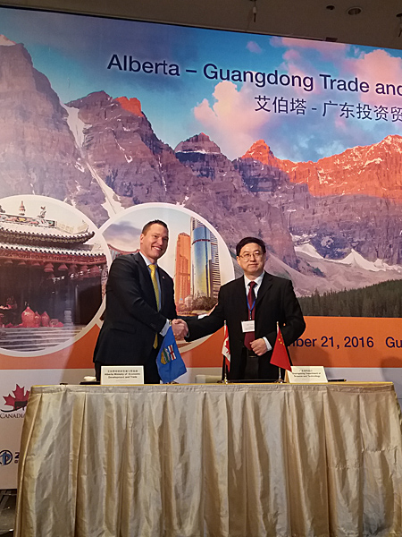 2016年11月21日上午,杨军副厅长出席加拿大艾伯塔省与广东贸易投资论坛,并在开幕式上代表我厅与代表加拿大艾伯塔省政府的经济发展与贸易厅部长毕德龙先生签署了合作谅解备忘录。加拿大驻广州总领事白静芳女士、省商务厅马桦副厅长、省贸促会张华副会长等双方嘉宾出席见证。