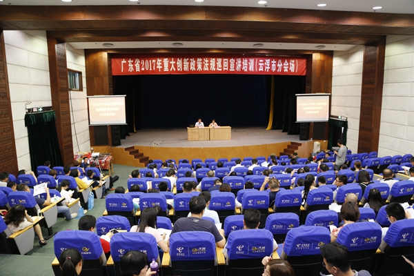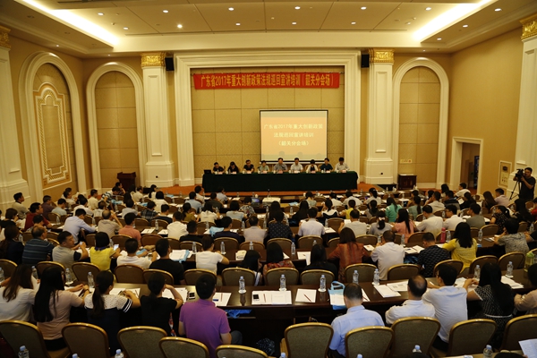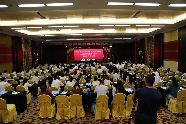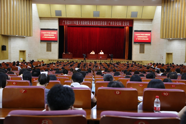 6月23日下午,广东省2017年重大创新政策法规巡回宣讲培训活动在广州圆满落幕。线上娱乐城厅副厅长郑海涛出席宣讲培训会并讲话,广州市科创委副巡视员李洪庆主持会议,线上娱乐城厅政策法规处、规财处、高新处、产学研处负责同志主讲,广州市科创委及县市区科技行政管理部门负责人,广州市及区各有关部门、企业领导及相关人员1000余人参加了本次宣讲培训会。广州电台、南方网、中国经济导报、大粤网等近20家媒体进行宣传报道,大粤网、广州电台等全程线上直播。